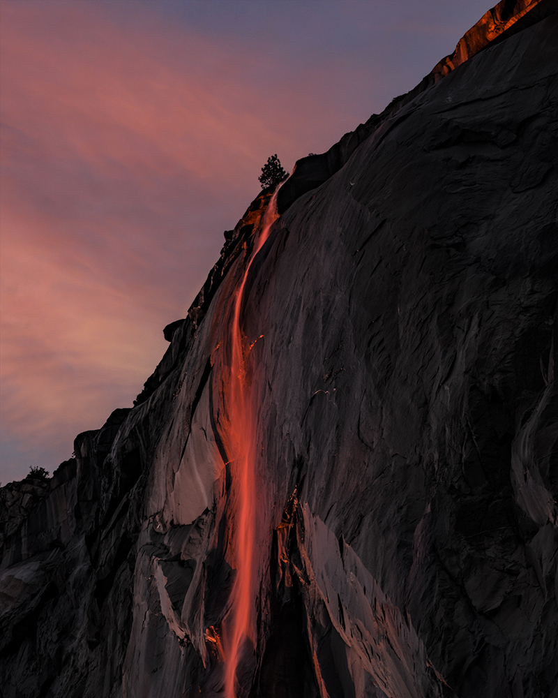 During sunset, the sunrays from the west side hit the El Capitan through a small slit between the mountains lighting up just the Horsetail falls & that’s about it.